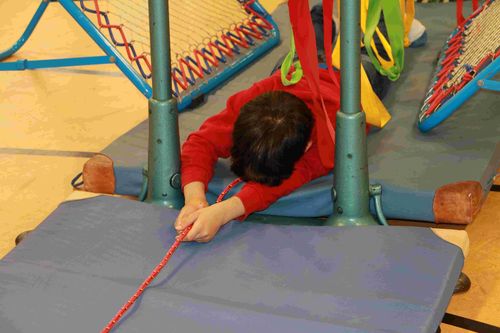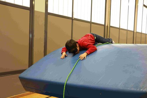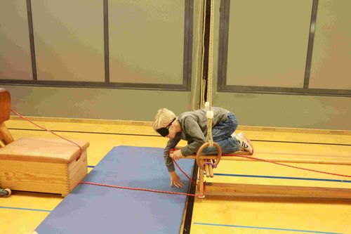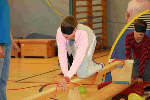 Die SchülerInnen überwinden mit verbundenen Augen einen Hindernissparcours. Zur Orientierung verläuft vom ersten bis zum letzten Hindernis ein Seil, an dem sich die SchülerInnen entlangtasten können.