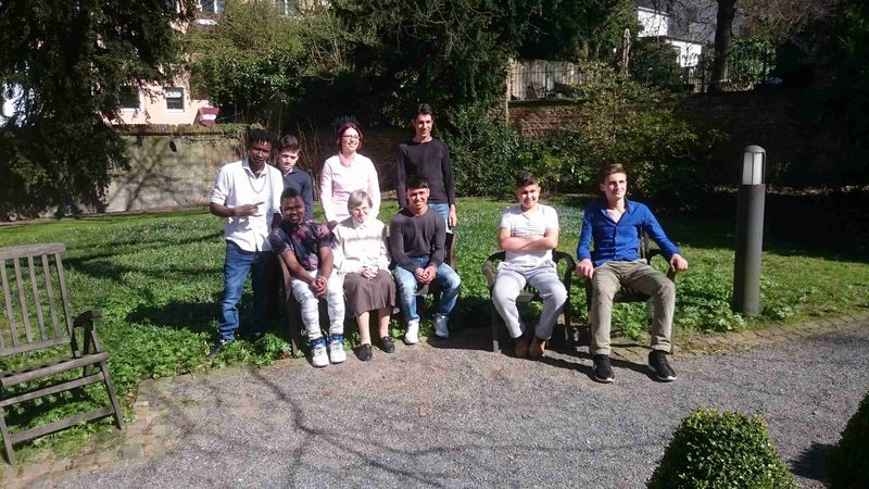 Das Foto zeigt eine Gruppe von Schülern der internationalen Förderklassen, die sich im März 2017 interessiert ein Seniorenheim in Aachen anschauten.